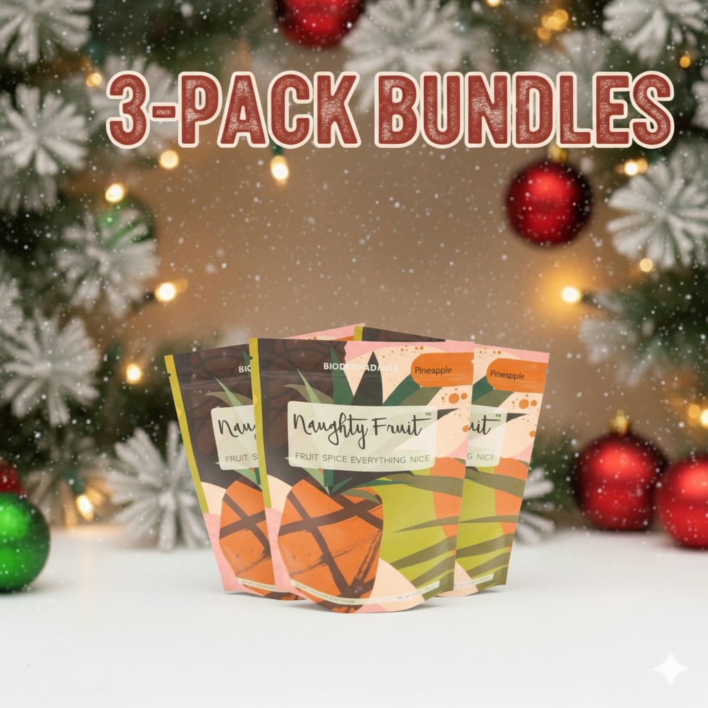 As we scale up operations here at Naughty Fruit we've been carefully analyzing our potential impact to the environment. With that said we're proud to introduce our new line of biodegradable packaging for Pineapple. Pineapple has by far been our most popular line which is why it made sense to first convert this line. With the goal of going 100% biodegradable, we will be slowly releasing new packaging as resources permit. Thank you and we hope you enjoy Naughty Fruit!